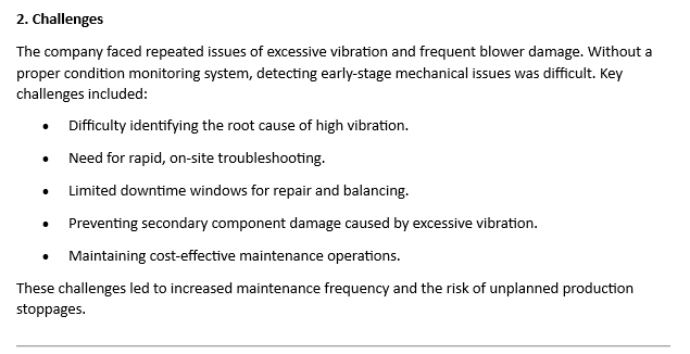 - Quick Installation: The wireless vibration sensors were installed and operational within minutes. No prior expertise was needed, allowing the factory's staff to quickly adopt the system and begin monitoring in real-time.