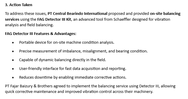 Solusi yang di tawarkan oleh PT CENTRAL BEARINDO INTERNATIONAL adalah menggunakan FAG DETECTORIII KIT + DETECTORIII BALANCING KIT dari Schaeffler untuk memudahkan customer melakukan pengecekan vibrasi fan lebih cepat dan akurat.