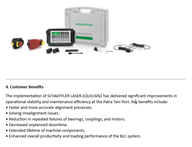 - Memperoleh data atau referensi teknis secara akurat berdasarkan laporan hasil analisis data getaran dan suhu secara akurat, memungkinkan pemberian data TRENDING terkait kinerja yang diperoleh dari Schaeffler SmartCheck.